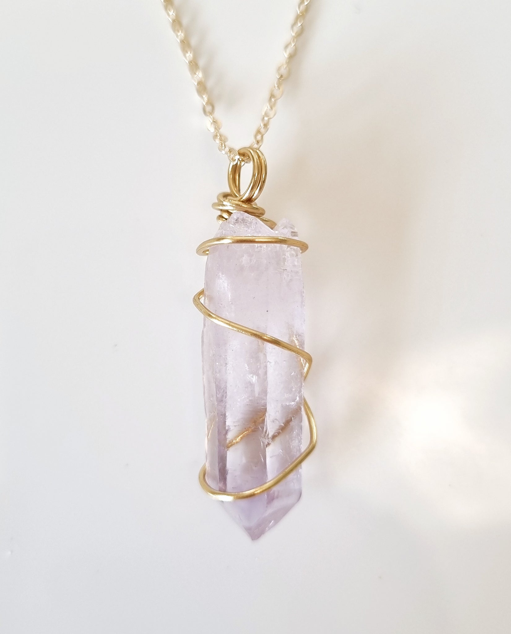 This beautiful pendant has been made with Brass wire and Brandberg Amethyst.