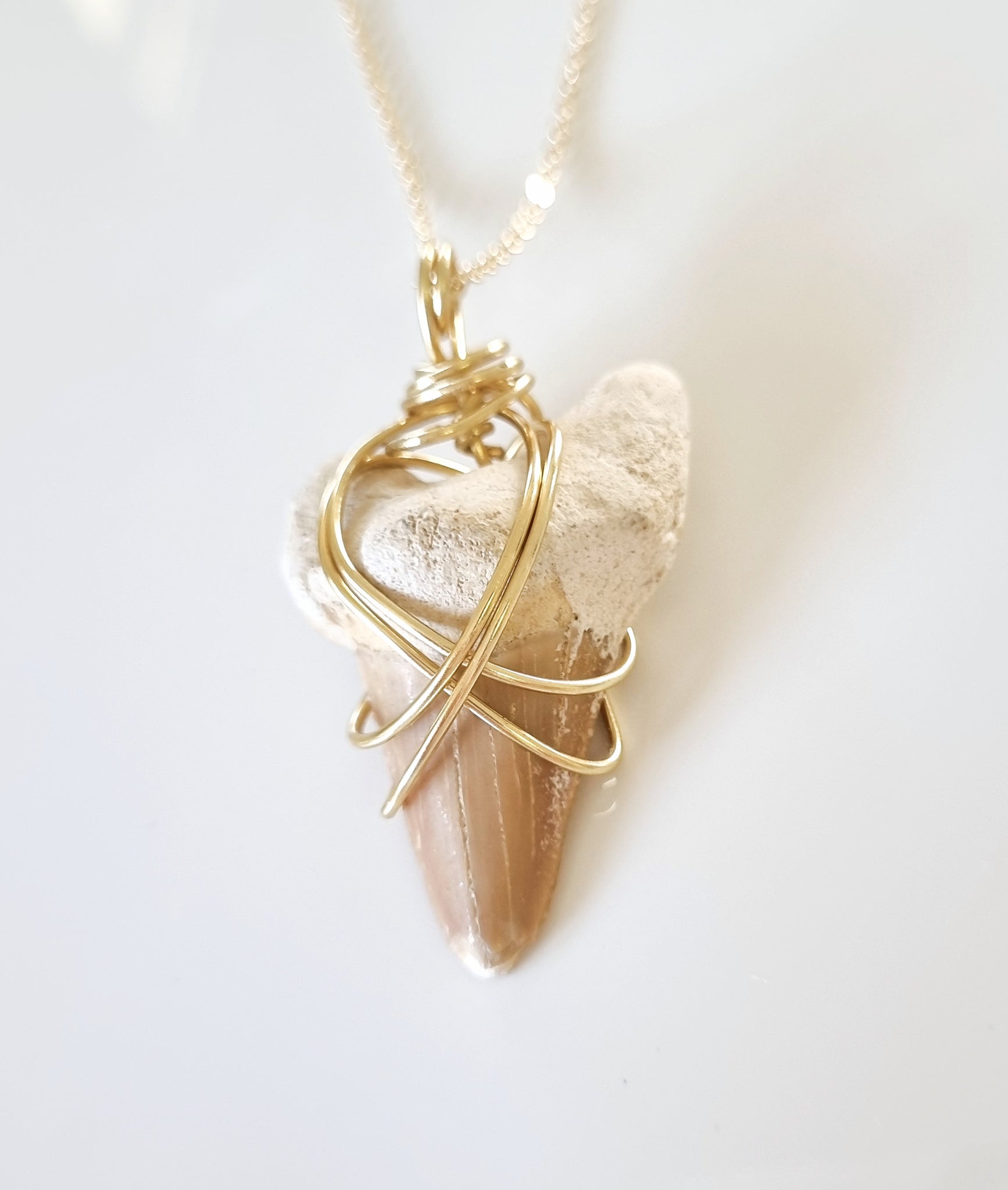 This beautiful pendant has been made with Brass wire and a Fossilised Shark Tooth.